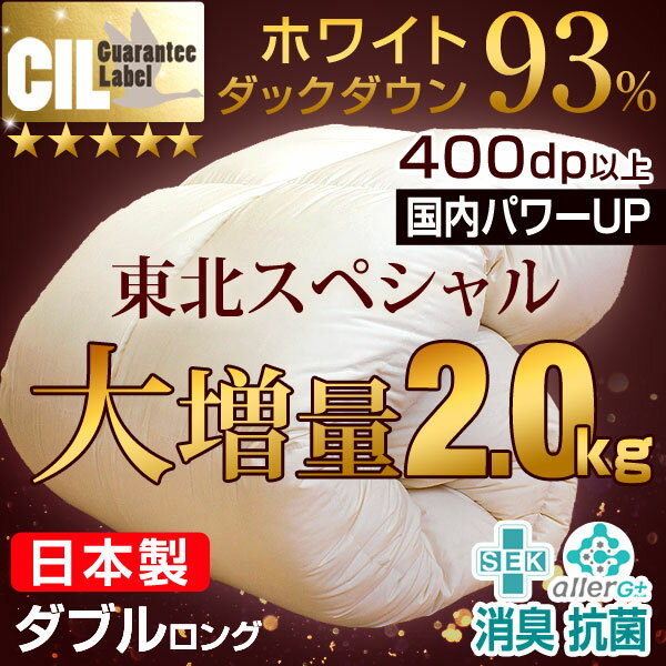 価格: 27,800円 レビュー評価:4.66 レビュー数:62 ページトップへ 他のサイズはこちら シングルシングルサイズはこちら! 国内パワーアップ加工&除菌防臭 1.5kg 仕様サイズ幅190x長さ210cm(ダブルロングサイズ) 重量:約2.97kg (充填量2.0kg) 【スタッフみどぅのおすすめポイント!】 ・ふっかふかの羽毛大増量2.0kg!・5つ星 CILゴールドラベル取得・安心の7年保証・ホワイトダックダウン93%・丁寧に仕上げた日本製・かさ高165mm以上、ダウンパワー400dp以上・国内パワーアップ加工でふっかふか!・新技術 アエルGプラスで消臭・抗菌・除菌・防臭・防ダニ・防カビ オゾンスペシャルエイド加工・ふとんがわはピーチスキン加工でなめらかな肌触り・羽毛の抜け出しを防止するダウンプルーフ加工・超軽量生地 ・立体キルト ループ数8カ所素材生地:綿15%、ポリエステル85%詰め物:ホワイトダックダウン93%、フェザー7%カラー 【 (更新日時:2017/11/20 18:41) Supported by 楽天ウェブサービス |
